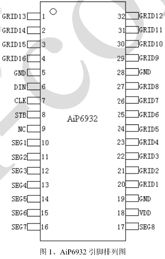 AiP6932是一款由無錫中微愛芯電子有限公司生產(chǎn)的3線串口共陰極8段16位LED驅(qū)動控制專用電路。這款芯片在LED顯示面板場合有著廣泛的應(yīng)用,如電磁爐、電飯煲、空調(diào)、機(jī)頂盒等家電產(chǎn)品的顯示。本文將詳細(xì)介紹AiP6932的引腳功能,為工程師和設(shè)計師提供全面的技術(shù)參考。