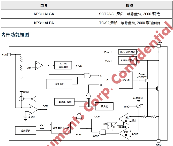 KP311AWPA具備一系列智能控制和保護(hù)功能,確保了芯片在各種工作條件下的穩(wěn)定性和安全性。芯片內(nèi)部設(shè)計(jì)有軟啟動(dòng)電路,能夠在啟動(dòng)時(shí)逐漸增加過流保護(hù)閾值,避免了啟動(dòng)瞬間的電流沖擊。此外,還集成了VDD欠壓保護(hù)、逐周期電流限制、異常過流保護(hù)、過熱保護(hù)、過載保護(hù)等多種保護(hù)功能,全方位保障了芯片及外部電路的安全運(yùn)行。