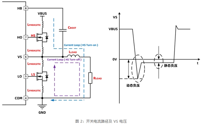 當控制信號HIN為低電平,LIN為高電平時,高側功率器件關閉,低側功率器件導通,電流從負載返回輸入端。