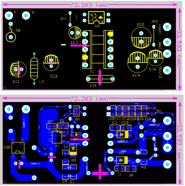 實物圖展示了BPA8604D電源模塊的緊湊結構和簡潔布局。整個電路板采用了單面板設計,尺寸僅為72mm×33.5mm,適合安裝在空間有限的設備中。電路板上的元件布局合理,走線清晰,便于生產制造和維修。通過實物圖,我們可以直觀地感受到BPA8604D電源模塊的高效能和可靠性,其簡潔的設計理念和精湛的制造工藝,使其成為了現代電源設計的典范之作。