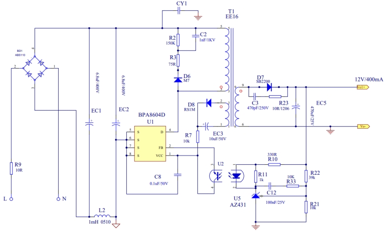 BPA8604D的電路設計簡潔而高效,充分體現了其高度集成化的特點。從電路圖中可以看出,整個電源電路主要由輸入濾波、整流橋、變壓器、反饋電路和輸出濾波等部分組成。輸入濾波部分采用了電解電容和貼片電容的組合,能夠有效濾除輸入電壓中的高頻噪聲,為后續電路提供穩定的輸入電壓。