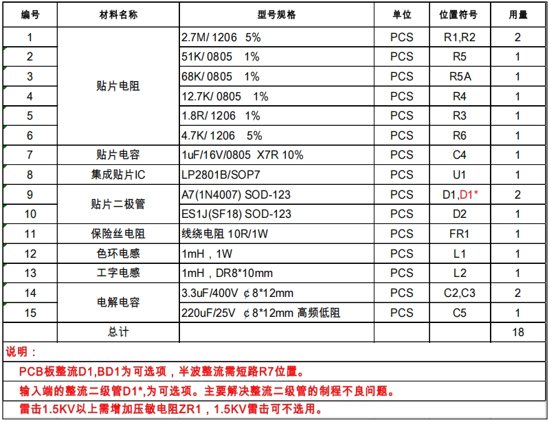 BOM表(物料清單)是實(shí)現(xiàn)LP2801B 12V150mA Buck設(shè)計(jì)的關(guān)鍵文件,它詳細(xì)列出了電路中所需的所有元件及其規(guī)格。以下是該設(shè)計(jì)的BOM表內(nèi)容: