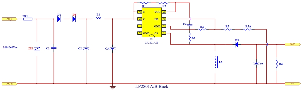 LP2801B 12V150mA Buck設(shè)計(jì)的原理圖是整個(gè)電源模塊設(shè)計(jì)的核心。其電路結(jié)構(gòu)主要包括以下幾個(gè)部分: