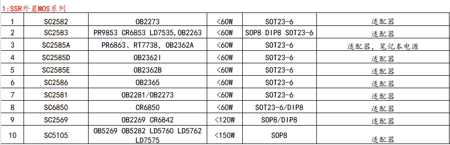 SSR內置MOS系列是鼎芯微電子推出的另一類高效電源管理芯片,適用于適配器、小家電等應用場景。以下是該系列部分型號及其替代型號: