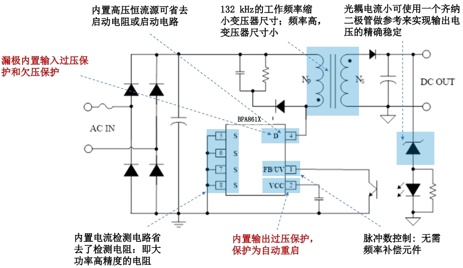 在設(shè)計(jì)細(xì)節(jié)上,BPA861X 也展現(xiàn)出了諸多優(yōu)化之處。它內(nèi)置了高壓恒流源,可以省去啟動(dòng)電阻或啟動(dòng)電路,簡(jiǎn)化了外圍電路設(shè)計(jì),降低了成本。同時(shí),BPA861X 還內(nèi)置了電流檢測(cè)電路,省去了檢測(cè)電阻,這不僅減少了外圍元件數(shù)量,還提高了檢測(cè)精度和可靠性。相比之下,友商產(chǎn)品在這些方面往往需要額外的外圍元件來(lái)實(shí)現(xiàn)相同的功能,這不僅增加了設(shè)計(jì)復(fù)雜度和成本,還可能因元件數(shù)量的增加而降低系統(tǒng)的可靠性。