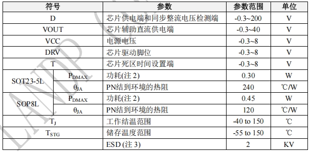 在電氣參數方面,LP35116-7 表現卓越。其 VCC 工作電壓范圍為 5.8V 至 6.4V,啟動電壓為 4.3V 至 4.7V,欠壓保護閾值為 3.8V 至 4.2V。整流管的開通電壓閾值為 -0.25V 至 -0.15V,關斷閾值為 -8mV 至 -2mV。驅動能力方面,其驅動電壓最大值為 6V,驅動腳出電流典型值為 1.5A,入電流典型值為 4A,上升時間為 25ns,下降時間為 10ns。這些參數確保了芯片在高效率和快速響應之間的良好平衡。
