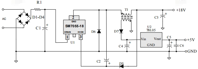 SM7055-18明微18V 250MA非隔離電源芯片直接替代VIP12/PN8012/CSC7612