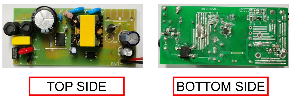 背面則主要布置了反饋控制電路和輸出濾波電路的元件,如光耦 PC817C、TL431、電解電容 E3 和 E4 等。通過合理的元件布局和走線設計,電路板在有限的空間內實現了高效的信號傳輸和電源轉換,同時保證了良好的散熱性能。