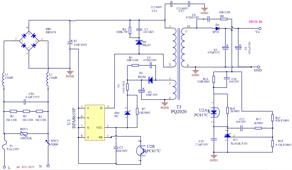BPA8619P 的電路圖是整個電源方案的核心,它詳細展示了電源電路的各個組成部分以及它們之間的連接關系。從電路圖中可以看出,該電源采用了典型的反激式開關電源拓撲結構,這種結構具有電路簡單、成本較低、易于實現等優點,同時也能滿足較高的性能要求。