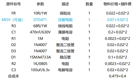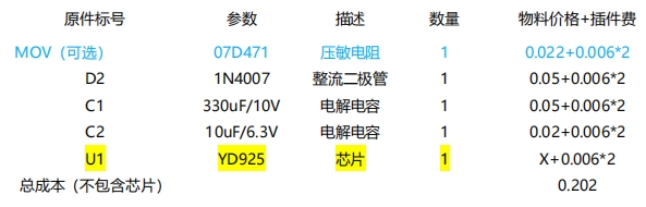 從 BOM 方案及成本來看,YD925 方案的物料種類大幅減少,且大多為貼片元件,尺寸小,可實現全貼片加工,極大地降低了生產成本和體積。以一個典型的 5V 輸出供電方案為例,YD925 的外圍電路簡潔明了,主要包括壓敏電阻(可選)、整流二極管、電解電容等常見元件,總成本(不包含芯片)僅為 0.202 元,相比傳統阻容降壓方案的 0.479+0.4 元,成本優勢不言而喻。