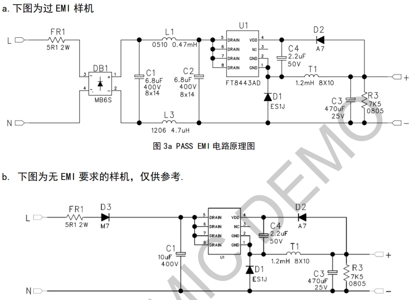 FT8443AD內置650V高壓MOS,使得IC在工作過程中溫度較低,進一步提升了電源的可靠性。同時,該方案還具備過壓、欠壓、過溫、過流以及輸出短路保護等多種保護功能,全方位保障電源的安全運行,延長電源的使用壽命。