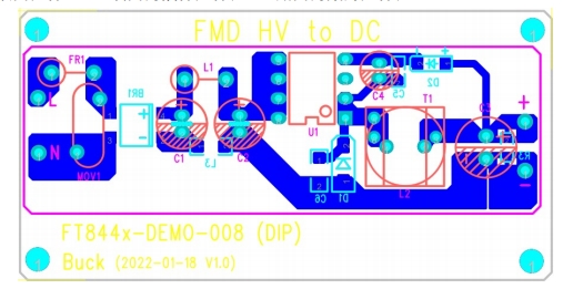 以下是基于 FT8443BD2 的 18V500mA 恒壓輸出電源的 PCB 布局示意圖。元件分布合理,走線清晰,便于生產(chǎn)和調試。