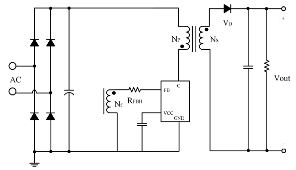 該系列芯片內置啟動電路,無需外圍啟動電阻,同時內置FB下偏電阻,固定峰值電流來實現取消限流電阻,并采用自供電方式取消輔助繞組VCC供電二極管,極大地簡化了系統成本。