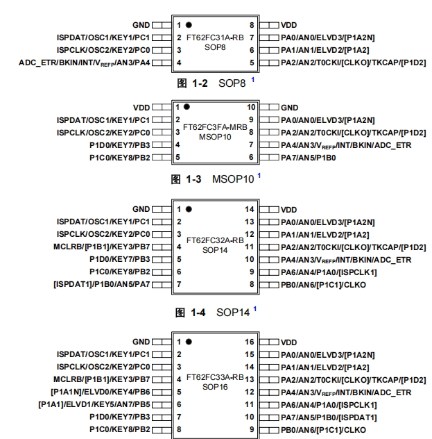 FT62FC6X系列微控制器根據不同的封裝類型和功能需求,提供了多種引腳配置。以下是結構框圖及一些常見的引腳及其功能介紹: