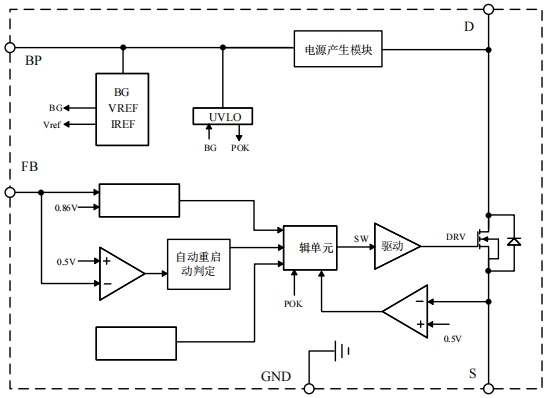 集成500V高壓功率管,無需外部啟動(dòng)電阻和輔助繞組供電,簡(jiǎn)化外圍電路;