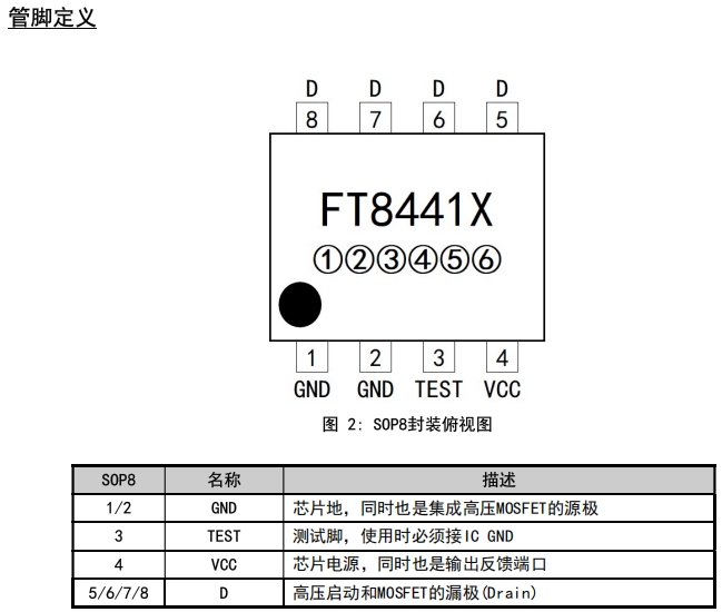 FT8441S 和 FT8441A 均采用 SOP8 封裝,其管腳定義如下表所示: