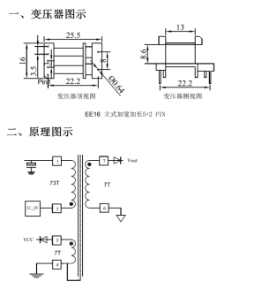 磁芯:EE16(立式加寬加長,5+2PIN),Ae 19 mm2,Bmax < 0.25 T