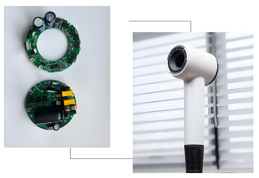 載波 24 kHz + 隨機 PWM 頻譜擴散,人耳敏感頻段能量下降 8 dB;風噪整體 < 60 dB,深夜吹發不擾民。