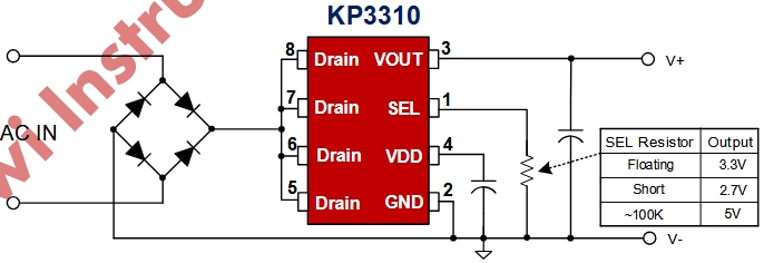 傳統AC-DC電源=整流橋+高壓電容+電感+PWM IC+光耦+...,哪怕只做3.3V/30mA,也至少十幾顆器件。KP3310把整套電路壓進一顆8腳芯片:無需電感、無需高壓電解、無需輔助繞組,直接85~305V交流進,5V/3.3V/2.7V穩壓出。對于“藏”在86盒里的智能墻壁開關、調光器、插座計量器來說,它就是“隱形”供電引擎。