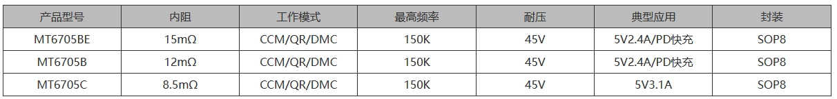 在快充適配器市場,5 V 3.1 A 的輸出規格已成為主流需求。MT6705C 是一顆內置 60 V 功率 MOSFET 的同步整流(SR)控制器,專為 5 V 3 A-3.1 A 級別快充適配器、排插 USB、車載充電器設計。采用 SOP-8 封裝,兼容 DCM/QR/CCM 三種工作模式,最高工作頻率 130 kHz,集成 VCC 自供電、漏源檢測、智能睡眠,可把次級整流損耗再降 30 %,輕松滿足 CoC V5 Tier-2 能效。