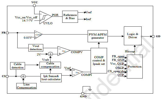 | 4 | CS | 原邊電流檢測(cè),500 mV 閾值,350 ns LEB |
