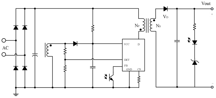 2. 采樣鏈:DET 腳“一箭三雕”——退磁檢測、母線欠壓、輸出過壓;CS 腳做峰值電流;FB 腳收光耦。