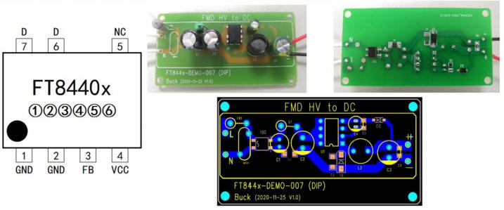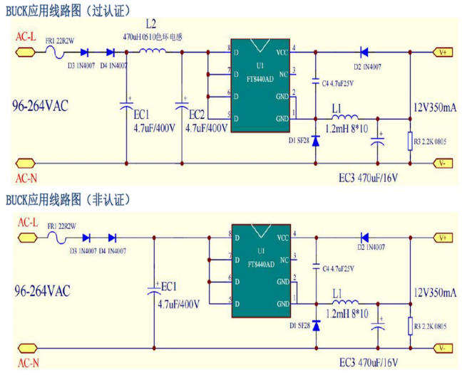 FT8440AD 支持 Buck 與 Buck-Boost 雙拓撲,同一套 BOM 只需改 2 個器件即可切換,方便一張 PCB 兼容 110 V 與 220 V 市場。