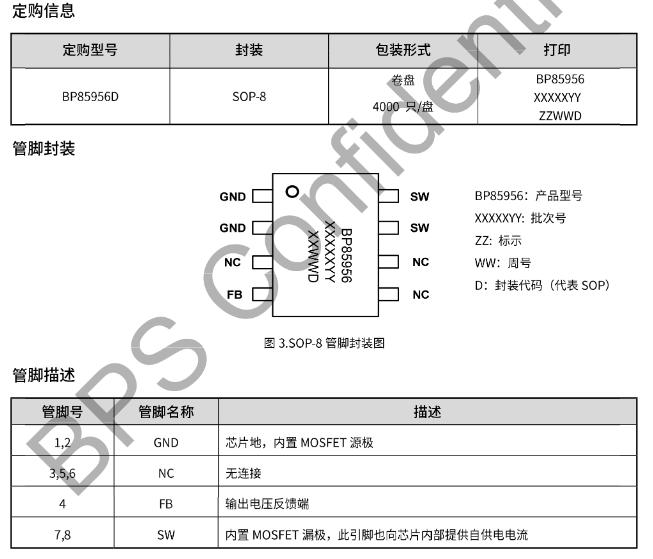 SOP-8封裝,絲印“BP85956D”下面還有一行小字“YYWWX”,內部批次碼。管腳定義如下(頂視圖逆時針):