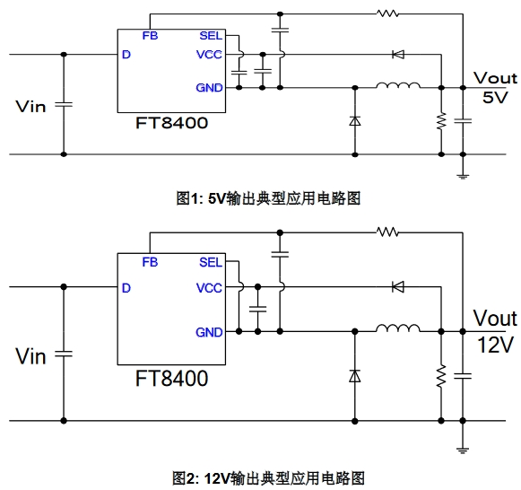 FT840X具有三種固定輸出電壓5V、9V和12V,可以通過SEL 腳進行設定。當SEL懸空時,輸出為5V;當SEL接160Kohm電阻到地時,輸出為9V;當SEL短路到地時,輸出為12V。
