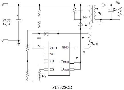 復(fù)合模式的應(yīng)用使得芯片能夠?qū)崿F(xiàn)低靜態(tài)功耗、低音頻噪音、高效率。而且高集成的功率 MOSFET 能夠降低外部 PCB的面積以及系統(tǒng)的成本。PL3328C 同時具有多種保護功能:逐周期峰值電流檢測、欠壓保護、過壓保護等。