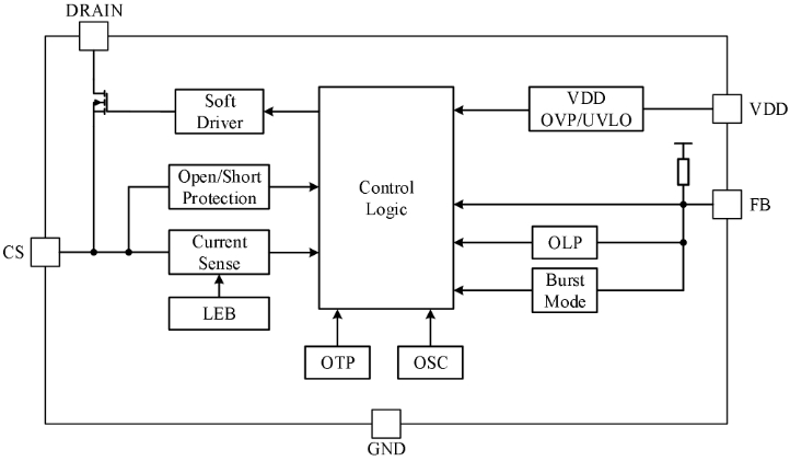 芯片通過對輸出采樣并反饋到光耦獲得高精度的恒壓輸出。內置的斜率補償電路確保了峰值電流模控制的穩定性。內部集成的頻率抖動功能可以改善EMC,降低EMI濾波成本。