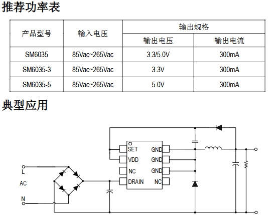 SM6035-X 是一款高精度非隔離、高集成度且低成本的降壓恒壓控制芯片,適用于 85Vac~265Vac 全電壓范圍應用;SM6035-X 內部集成500V高壓功率管,內置 CS 電阻,無需外部補償元件,即可實現優異的線性調整率和負載調整率,外圍元件極少,大大的降低了系統的成本,節約了PCB的尺寸。SM6035-X 應用于多種供電電源領域,提供3.3/5V 兩種規格輸出電壓。同時芯片集成有完備的保護功能,過溫保護、過壓保護、欠壓保護等,保證了系統的可靠性。