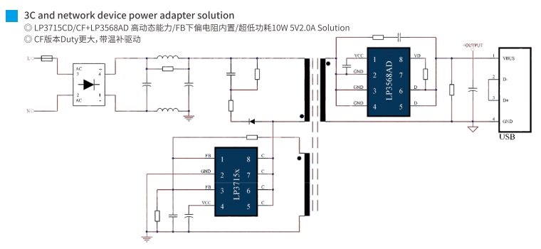 在3C(計(jì)算機(jī)、通信和消費(fèi)電子)設(shè)備和網(wǎng)絡(luò)設(shè)備的電源適配器領(lǐng)域,10W的輸出功率是一個(gè)常見的需求點(diǎn)。為了滿足這一需求,LP3715系列提供了多種解決方案,這些方案不僅能夠提供穩(wěn)定的電源輸出,還能根據(jù)不同的應(yīng)用場(chǎng)景提供定制化的功能。本文將詳細(xì)介紹LP3715系列在10W電源適配器中的應(yīng)用,包括其技術(shù)規(guī)格、特點(diǎn)以及推薦的應(yīng)用場(chǎng)景。