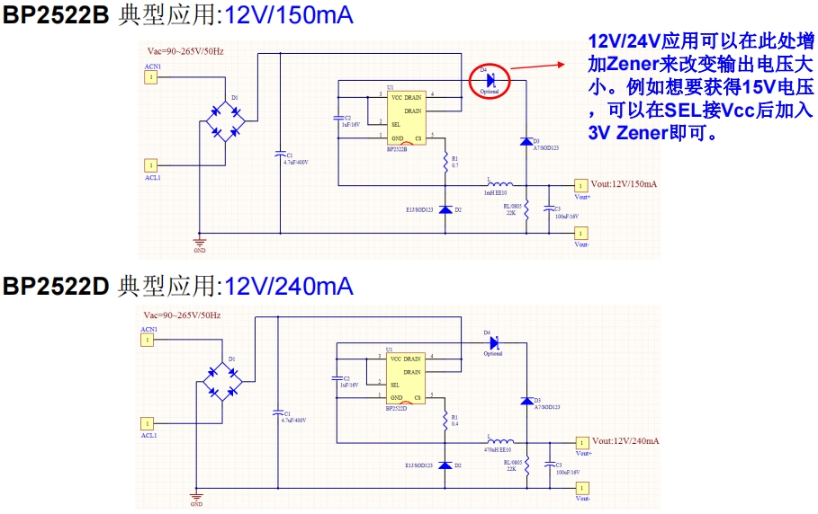 以BP2522B為例,其在12V輸出應用中的典型電路設計如下: