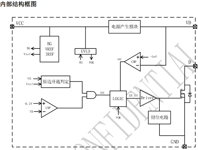 LP15R060S的內部結構框圖揭示了其復雜的內部電路設計。電源產生模塊、BG(帶隙參考)、VREF(參考電壓)、IREF(參考電流)等關鍵部件共同工作,確保芯片的穩定運行。此外,芯片還包含原邊開通判定、鉗位電路、比較器等,這些部件協同工作,實現對同步整流管的精確控制。