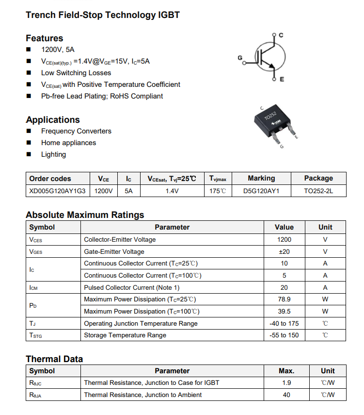 XD005G120AY1G3 國產IGBT 芯達茂 5A 1200V TO-252-3L